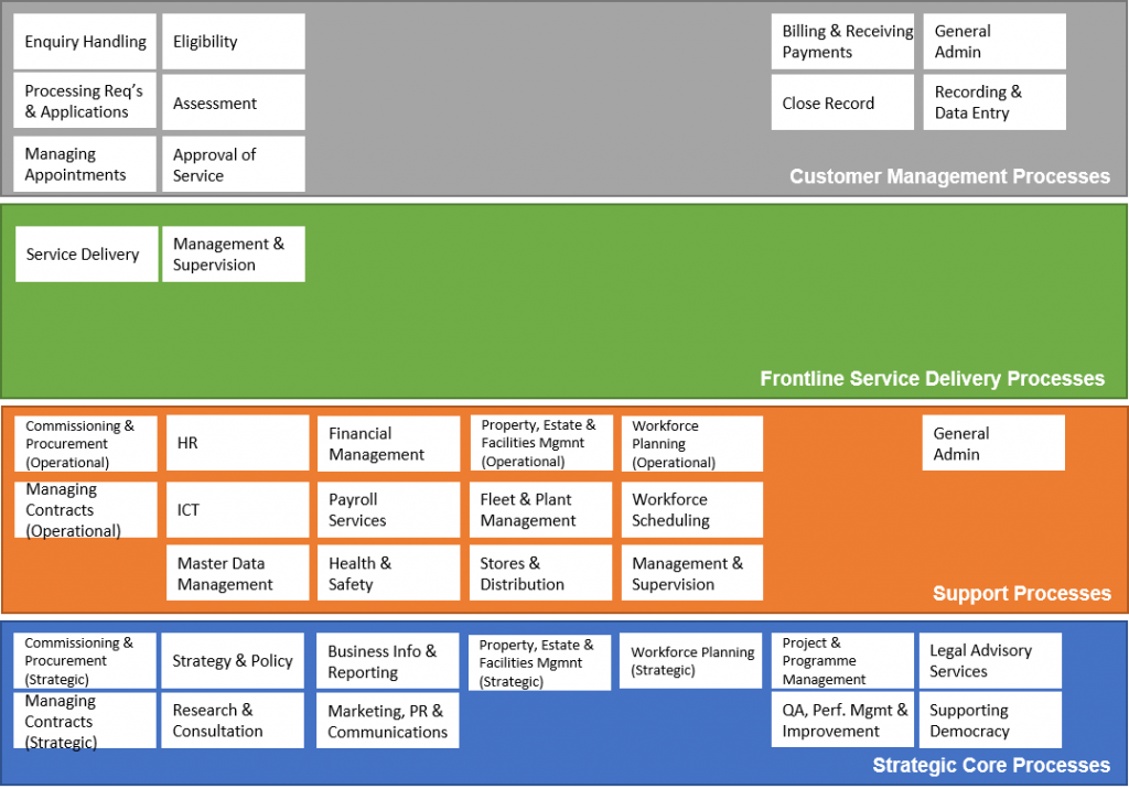 The work to populate this kind of framework would largely be internally focused. It would involve gathering lots of data about activities and identifying where work was duplicated and fragmented across functions. The aim would be to find and remove inefficiency.
